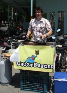 ![]() Ghostburger. Der stolze Besitzer nennt sich auf Chinesisch Xiao gui, was so viel heißt wie kleiner Geist... Die positive Seite dieses kreativen Chaoses ist, dass sich jeder einfach mal an verschiedenen Berufen ausprobieren kann. So hat auch einer meiner Mitstudenten, zu Hause Student an der Eliteuniversität Yale, mal eben ein Quartal Chinesischunterricht ausgesetzt um stattdessen einen eigenen Burgerstand auf dem Nachtmarkt aufzumachen. Eine Kühltasche, eine Gasplatte mit Gasflasche, eine Pfanne, viel mehr braucht man nicht für das Kleinstunternehmen. Ghostburger warden geboren. Selbstverständlich müssen auch hier in Taiwan Genehmigungen eingeholt werden, auf dem Nachtmarkt, munkelt man zumindest, sowohl von der Polizei als auch von der Mafia, aber es ist trotz allem sehr viel weniger umständlich als daheim. Auch Flügel ist solch ein eine-Frau-Unternehmen. Es ist ein kleines Geschäft in einer kleinen Nebenstraße. Der Laden besteht aus einer Verkaufstheke mit vier Hockern. Es gibt nicht mehr als drei Sorten Kuchen pro Tag, meistens Rührkuchen. Und Tiramisu. Die Besitzerin backt alle Kuchen selber in ihrer WG Küche, auch den Verkauf macht sie fast immer alleine. Sie hat eine Zeitlang in Deutschland studiert und fand die Kuchen dort so toll, dass sie diese Kunst nach Taipei bringen wollte. Wir haben also zu fünft in ihrer WG-Küche Torte gebacken, wobei sich der Spruch mit den vielen Köchen bewahrheitet hat. Der aber wohl besonders gilt, wenn drei der fünf Köche noch nie gebacken, Sahne geschlagen oder Kirschen eingedickt haben. Oder überhaupt echte Torte gegessen haben. Und der Ofen ein kleiner Toasterofen ist. Und das Spezialgeschäft mit den Backzutaten ausgerechnet am Backtag geschlossen hat. Das Unterfangen Torte in Taiwan hat letztlich sehr viele, schweißtreibende Stunden gedauert, dafür aber auch jede Menge Spaß gemacht. Und geschmeckt. Ansonsten habe ich nun tatsächlich schon drei meiner vier Quartale im ICLP hinter mir. So richtig fassen kann ich es nicht. Andererseits merke ich an meiner Erschöpfung, dass tatsächlich viel Wasser den Jilong Fluss herunter geflossen ist, seit ich hier am Lernen bin. Man munkelt, das Sommerquartal sei lockerer als die anderen drei, ich hoffe es sehr. Im Moment habe ich zwei ganze Wochen Ferien, genügend Zeit also, um ein wenig Luft zu schnappen vor dem Endspurt. Die erste Ferienwoche habe ich vor allem mit Abschied verbracht, da der Großteil meiner Mitstudenten nach diesem Quartal wieder nach Hause gereist ist. Nur wenige Tapfere bleiben nicht nur für das akademische, sondern für das ganze kalendarische Jahr. Dafür kommen über den Sommer viele neue Studenten, die nur für die Summer School nach Taiwan reisen. Neben Taschentuchwinkerin war ich in dieser Woche vor allem Taipeitouristin. Endlich einmal habe ich mir die Zeit genommen, die Ecken Taipeis und Umgebung zu erforschen, die man als typischer Besucher Taipeis besichtigt, als gestresster Bewohner aber allzu gerne vernachlässigt. Ich war am Jilong Fluss spazieren, im Wissenschaftsmuseum spielen und in einem KTV-Koloss (Karaoke-Burg mit privaten Zimmern) singen. Ich bin mit der Gondel hoch zu den Teehäusern von Maokong geschwebt, wo wir uns nach einem Spaziergang durch die Teeplantagen auf der Terrasse eines Teehauses mit Panoramablick auf Taipei ausgeruht haben. Dort konnten wir einen extrem feinen Oolong-Tee und ein ebenso leckeres Abendessen inklusive Teeblattreis genießen während über unseren Köpfen der Himmel langsam dunkel und zu unseren Füßen die Stadt langsam hell wurde.